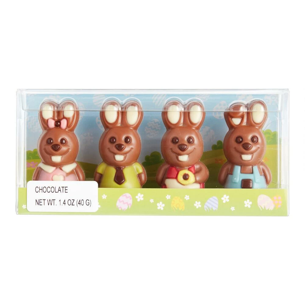Rich German chocolate is shaped into a family of mini bunny rabbits, each with their own adorable outfit and sweet, detailed face. Perfect for Easter baskets and spring celebrations, these yummy rabbits are almost too cute to eat. Almost.